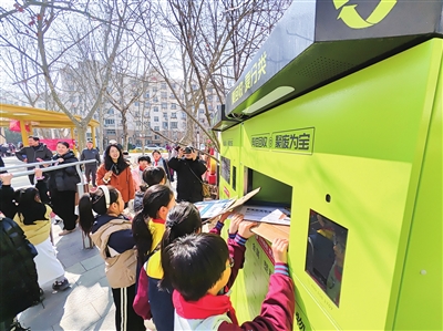 小学生体验“爱回收·爱分类”智能回收设备使用。