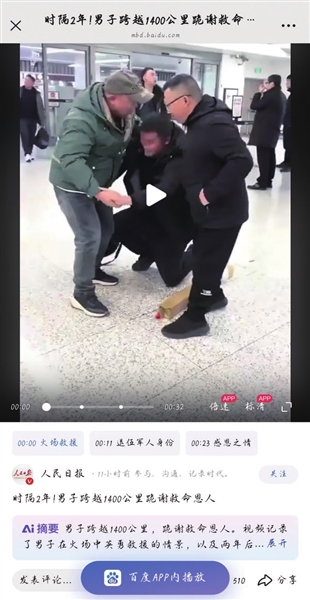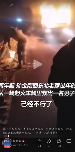 昨日,人民日报官方百家号发布视频《时隔2年!男子跨越1400公里跪谢救命恩人》,回顾了孙金刚的救人经过,以及范文旭见到救命恩人后激动下跪的感人瞬间,引来数万网友围观。广东网友“简爱更幸福”说道,“这个男人当时在车里面被烧的时候,一定觉得自己要没命了,闪回自己这一生的时候,忽然一道亮光出现,闯进去一个英雄把他救了出来。”甘肃网友“深圳有zhoumi”隔空喊话获救者范文旭:“太感人了!有恩必报,这才是真正的爷们儿!恩人一定也会为你的诚意和勇气感到骄傲!”