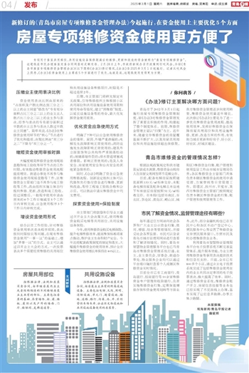 专项用于房屋共用部位、共用设施设备保修期满后的维修、更新和改造的资金被称为“房屋专项维修资金”,这笔钱在市民办理房屋交易合同网签时足额交存。2月28日上午,市政府新闻办召开政策例行吹风会,介绍《青岛市房屋专项维修资金管理办法》(以下简称《办法》)修订情况,《办法》自2025年3月1日起施行。记者从吹风会上获悉,《办法》在资金使用上主要在5个方面进行了优化,也就是说,这笔钱使用变得更为方便。
