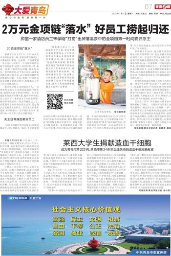 “这条金项链对我很有意义,发现项链没了,当时很着急。”事后,失主张爱莲从滨州市博兴县专程来到青岛,将一面印有“拾金不昧风格高,服务周到品德好”的锦旗交到宋学刚手中,感谢他拾金不昧的善举。张爱莲激动地说:“要不是宋师傅,我也不能这么快就找到项链。青岛的酒店服务太好了,我回家后要告诉亲朋好友,让大家都来青岛玩。”谈及当初捞起“落水”金项链的想法,宋学刚坦言自己的第一反应就是替失主着急,“当时我只想着这条金项链很贵重,失主肯定很着急,必须找到失主尽快归还。”宋学刚说。