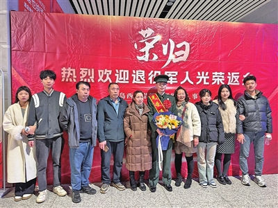 记者注意到,青岛西站的“荣归”返乡接待站,还有一个十几人的“亲友团”正翘首以盼。“去时懵懂少年,归时顶天立地”的横幅,饱含着亲友们对退役士兵程宇最殷切的祝福与期盼。