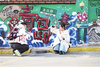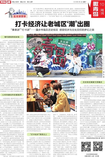 “这个壁画画得太好了,非常有感觉,把两个主角的形象结合起来,感觉特别震撼。”游客黄女士告诉记者,自己这几天在青岛旅行,她特别喜欢漫步青岛老城区的那份松弛感,恰好在网上刷到这处壁画打卡点,就忍不住想要来看看。