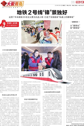 青岛地铁2号线运营开通7年,共运送乘客5.57亿人次,平均每天有近30万人次乘坐2号线出行,是名副其实的“骨干线”。去年3月5日,青岛地铁2号线正式升级为“学雷锋实践线”,成为青岛地铁打造的全国首条“轨道上的雷锋线”。到今年3月5日,这条“轨道上的雷锋线”正好满一岁。这一年的时间里,这条地铁线上都发生了哪些故事?这条线有哪些特殊之处?记者就此进行了采访。