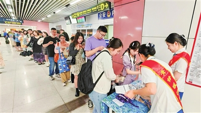地铁工作人员为看演唱会的乘客发放“嗨听”好物。