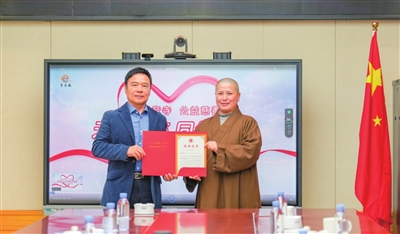 王伟会长(左)代表市慈善总会向教圆法师颁发捐赠证书。