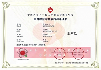 中国关工委教育中心证书样本。青少年艺术水平测评山东管理中心供图