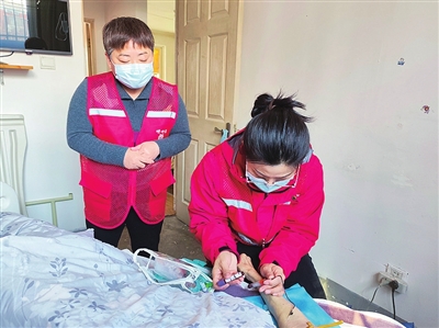 家医助理林琳回忆,去年年底家庭医生上门服务时,发现王奶奶全身皮肤出现多处疱疹及破溃,被子和枕头到处都是血水,家属很是苦恼。“医生诊断王奶奶的情况是天疱疮,这种病的治疗方法是去上级医院住院进行激素治疗,但是老人年龄大,治疗有风险,家属恳请我们继续帮忙居家治疗护理,我们便每周上门换药,并指导家属如何消毒、用药、肢位摆放、饮食指导等,经过两个月的时间,现在终于不再产生新的疮面。”