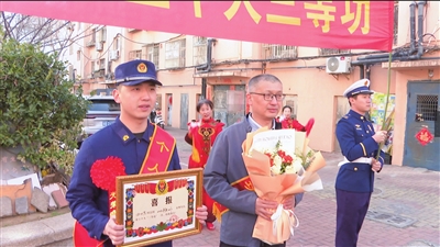 “曲世恩同志,因工作表现突出,荣立个人‘三等功’,请出列,接受奖章。”3月14日,青岛市消防救援支队、崂山区消防救援大队为荣立个人“三等功”的消防救援人员曲世恩举行“送奖到家”仪式,并为他的父亲披上象征荣誉的表彰绶带。