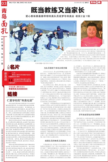 “从2月初带队员们到吉林参加国家队集训,到3月前往意大利都灵参赛,这40多天的时间,队员们展现出了顽强的意志品质。”蔡嘉德难掩喜悦之情。3月17日,蔡嘉德带着他的爱徒——两位刚参加完第12届世界冬季特殊奥林匹克运动会的队员陈亮和龚梓悦返回了青岛。本届冬特奥会,青岛市两名运动员、一名教练员首次入选国家队,并在雪鞋走项目上获得2金1铜,创造了青岛特奥运动员参加冬特奥会的最佳成绩。而这40多天,也是蔡嘉德又一次“既当教练又当家长”之旅。
