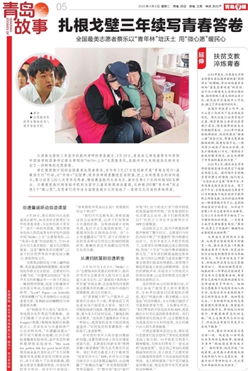 从黄海之滨到帕米尔高原,从脱贫攻坚战场到乡村教育一线,蔡乐虽然在3年服务期满后离开了西部,但是这份经历让他更加懂得责任与奉献的意义。尽管身份发生了转变,但他始终没有忘记志愿服务的初心。刚担任辅导员时,他做的第一件事就是鼓励更多学生参与志愿服务活动,希望将自己在喀什收获的温暖与信念传递给更多年轻人。他相信志愿服务不仅能改变他人的生活,也能让参与者找到属于自己的价值与力量。他回青岛之后,一直和喀什地区的志愿服务团队保持联系,希望能尽快组织起学生,带领他们回到喀什,开展暑期常态化的支教,“线上支教虽然已经打通了,但我还是希望引导更多人在线下服务。”