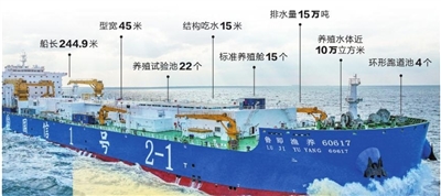 新一代养殖工船在功能布局、养殖系统、新能源利用、信息一体化等领域实现160余项技术突破与优化创新,将以“船载舱养”模式开展大黄鱼、鲑鳟鱼等名优鱼种养殖,设计年产高品质鱼类约3600吨