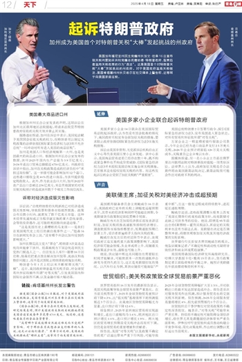 加州是美国人口和经济规模第一大州,也是美国最大的商品进口州。根据加州州长办公室发布的数据,该州2023年国内生产总值为3.9万亿美元,2024年进出口贸易总额接近6750亿美元。州政府在诉状中指出,加州在关税政策造成的经济负担中“承担过高份额”。这一举措可能会影响加州12个港口,这些港口接收全美40%的进口商品,为该州提供稳定税收收入。此外,作为农业出口大州,加州2022年农产品出口总额达236亿美元,来自其他国家的对美反制关税预计将造成该州数千个相关工作岗位流失。