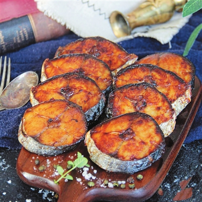 青岛人熏鲅鱼很是讲究。半冻的鲅鱼下刀,切成大约1.5厘米厚的块,然后给鲅鱼泡个温水,在水里轻轻揉搓,内脏混着瘀血打着旋儿溜走——这可是腥气的“老巢”。沥干水的鱼片码进盆中,用葱姜和花椒压阵,白酒一浇,腥味当场蔫了三分。趁着腌鱼的工夫,灶上早支起了香料阵:花椒放入其中,八角掰碎爆香,桂皮香叶往锅里跳去。
