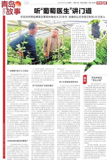 “着色期最佳温度为28℃,夜间温度不低于13℃,昼夜温差不少于12℃;如果当晚温度过低,就得下午3点闭棚保温,这样培育的葡萄色泽均匀,能卖个好价……”4月16日,莱西市孙受镇的一处冬暖式葡萄大棚里,贾延樽一边为葡萄树分杈,一边通过“一起葡萄”微信公众号,向在线的2300余名果农讲解葡萄着色期的管理。在田间开直播对老贾来说是家常便饭,“沿着‘云’端学技术,跟着老贾创增收”已然成为全国多地葡萄种植户的“口头禅”。贾延樽给记者看他的“一起葡萄”微信公众号,粉丝量竟然达到了44万人之多。