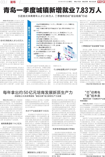 早报4月24日讯 4月24日,记者从青岛市人力资源和社会保障局召开的2025年一季度工作新闻发布会上获悉,全市就业形势总体稳定,在全省率先出台促进高质量充分就业25项措施,推动出台促进高校毕业生就业创业免租金住宿保障及新一轮社保补贴、创业补贴等政策。一季度,全市城镇新增就业7.83万人,同比增长12.34%,城镇失业人员再就业3.05万人。