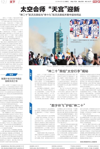 据中国载人航天工程办公室介绍,飞船入轨后,将按照预定程序与空间站组合体进行自主快速交会对接,神舟二十号航天员乘组将与神舟十九号航天员乘组进行在轨轮换。在空间站工作生活期间,神舟二十号航天员乘组将在空间生命与人体研究、微重力物理科学、空间新技术等领域开展多项实(试)验与应用,进行多次出舱活动,完成空间站碎片防护装置安装、舱外载荷和舱外平台设备安装与回收等任务。