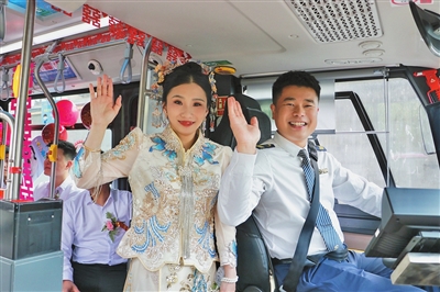 “来了来了!”5月10日上午,随着现场围观亲友的欢呼声,“宝宝巴士”的车门缓缓打开,身穿中式礼服的新娘曲晓彤被亲友簇拥着走下车。朱琛琛转身为她递上一束鲜花,并朝亲友们喊道:“今天终于开‘宝宝巴士’娶到我心爱的女孩啦!”车厢内外顿时响起掌声和笑声。这对新人选择了最特别的方式——公交车接亲,不仅圆了他们的“宝宝巴士”梦,还用实际行动践行了低碳环保的理念。