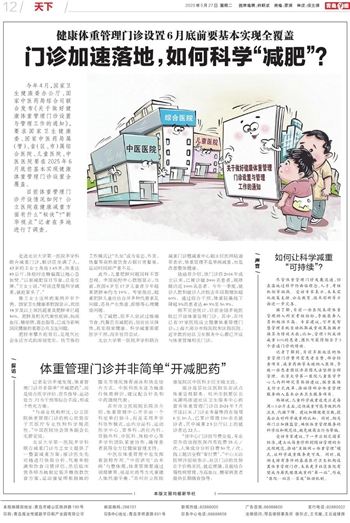 今年4月,国家卫生健康委办公厅、国家中医药局综合司联合发布《关于做好健康体重管理门诊设置与管理工作的通知》,要求国家卫生健康委、国家中医药局属(管)、省(区、市)属综合医院、儿童医院、中医医院要在2025年6月底前基本实现健康体重管理门诊设置全覆盖。