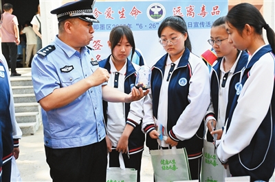 民警用仿真毒品样本向学生讲解毒品危害。