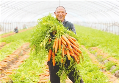 莱西市店埠镇村民抱着收获的胡萝卜笑逐颜开。
