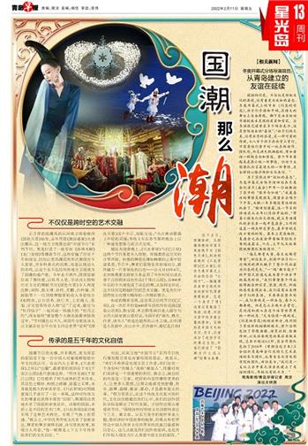 国潮的闪亮,不仅仅是传统文化的再现,还有着更为放松的姿态。冬奥开幕式上的节目 《闪亮的雪花》,孩子们手持和平鸽,在偌大的舞台上自由奔跑,脚下是由实时动作捕捉技术呈现的星星和雪花。总导演张艺谋曾在多个场合表示,这是整场演出的“最佳”:“孩子们的天真,还有冰雪的浪漫,是一种可爱的传递,七八百个孩子在冰雪上穿行,不需要他们整齐划一地去做动作、排队形,而是满天飘洒般的、有如童话一样的自由和浪漫,整个节目看起来是很小的一件事情,但对于主创团队而言是很大的一件事情,是全新的心路历程和文化自信。 ”