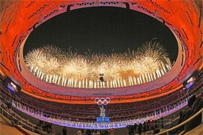 盛大焰火腾空而起,在体育场上空呈现出五环形状、“天下一家”中英文字样,歌声、掌声、欢呼声响彻云霄,国家体育场成了欢乐的海洋。