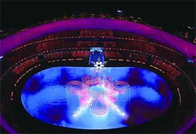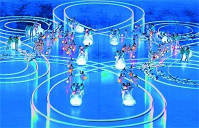当12只生肖冰鞋滑载起孩子们旋转飞舞,天地瞬间变为一方欢乐热烈的梦幻冰场。沙晓岚介绍,冰鞋在地屏上留下的“痕迹”逐渐形成一个“中国结”形状。与此同时,由AR(增强现实)技术生成的美丽红线,在天空上优雅生长,编织成一个巨大的中国结包裹雪花火炬,与地面影像交相辉映。 “运动员挥舞五彩斑斓的参赛代表团旗帜,在‘中国结’线条的包裹中入场,世界各国之间的连接和大同在这一刻彰显无遗。 ”