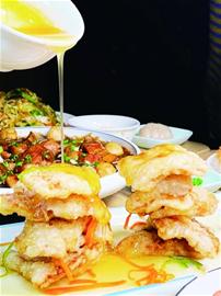 锅包肉的前身叫“焦炒肉片”,大厨用酸甜的糖醋裹着炸好的肉片端上桌,并给它起了个名字叫——“锅包肉”。 “做锅包肉没有太多技巧,切好的肉片抓上湿淀粉放锅里炸好,捞出来裹上汁出锅就行。 ”听着简单,但讲究“尺度”和“温度”。锅包肉也分派别,“黑龙江锅包肉是传统派,烹汁时用的是糖和白醋,出锅金黄。而辽宁锅包肉裹番茄酱汁,颜色红亮。 ”霞姐的锅包肉则中和了两者的味道和色泽,把锅包肉做得酸甜适中,肉支棱在盘子里看着干,但一筷子送到嘴边,张嘴吸气就能被白醋味儿呛到,一口下去又酥又软。