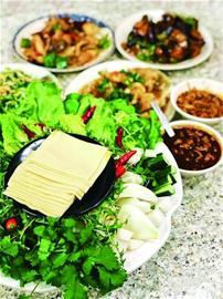 说起减肥,菜蘸酱是地道标准的东北小清新。东北蘸酱菜丰俭由人,普通的大葱、蒜苗、洋葱等直接摆上桌,油麦菜、娃娃菜、芹菜这样其他地区很少生吃的菜,在东北亦可以拿来生吃。而除了蘸酱菜,还可以升级做成东北大拉皮,拉皮配上色泽鲜艳的蔬菜,再加上陈醋或大酱等调料,同样鲜美清爽。