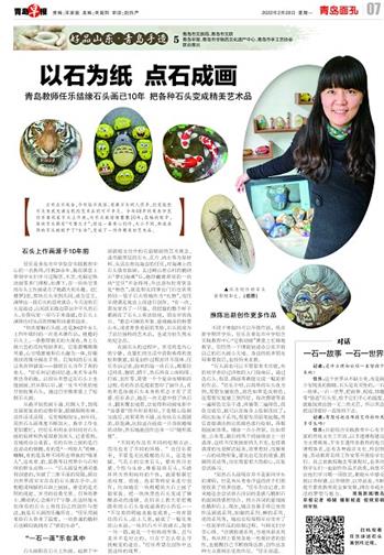石头画即在石头上作画,起源于中国敦煌文化中的石窟壁画的艺术理念,选用最常见的石头、瓦片、砖头等为原材料。生活在青岛海边的任乐,对海滩上的石头情有独钟,去过崂山青山村的鹅卵石“梦幻海滩”后,她珍藏着那里的一块块“宝贝”不舍得用,外出游玩时常常各处“物色”,就连朋友同事出门后也常常拎回一袋子石头给她作为“礼物”,而任乐便满足地在上面进行创作。 “有一次,朋友家养了一只猫,我把猫的整个样子都画在了石头上再送给他,朋友非常高兴。 ”憨态可掬的形象、意境幽深的粉墨山水,或者青春美丽的笑脸,石头画成为了品位独特的艺术品,也成为恒久隽永的纪念品。