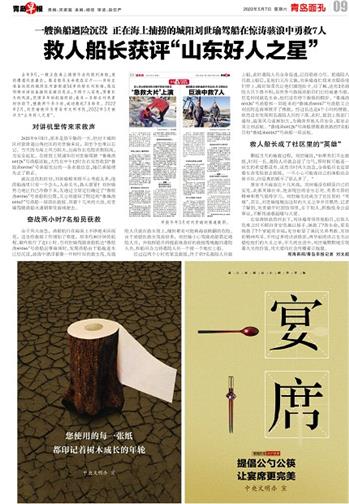 去年9月,一艘正在海上捕捞作业的胶州渔船,突然遭遇风浪袭击,数名船员生命危在旦夕……当时正准备返航的城阳区河套街道56岁的船长刘世瑜,通过同频对讲设备接到求救信息后,不顾个人安危,顶着巨大的风浪,凭借多年的航海经验,在另一名船长刘承革的协助下,搜救两个多小时,成功救起7名船员。 2022年2月,刘世瑜被评为青岛市文明市民,2022年3月被评为“山东好人之星”。