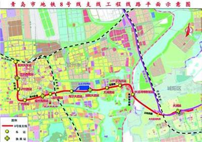 地铁8号线支线起于地铁8号线大涧站,终于胶州火车站,均为地下线,全长20.4公里,共设车站12座,车辆基地1座(云溪河车辆基地,主要功能为地铁列车停放、检修、维护保养)。其中,胶州段全长15.8公里,设车辆基地1座(云溪河车辆基地),车站11座,分别为:大沽河博物馆站、少海北站、太湖路站、站前大道站、海尔大道站、温州路站、福州南路站、广州路站、泸州路站、兰州西路站、胶州火车站。