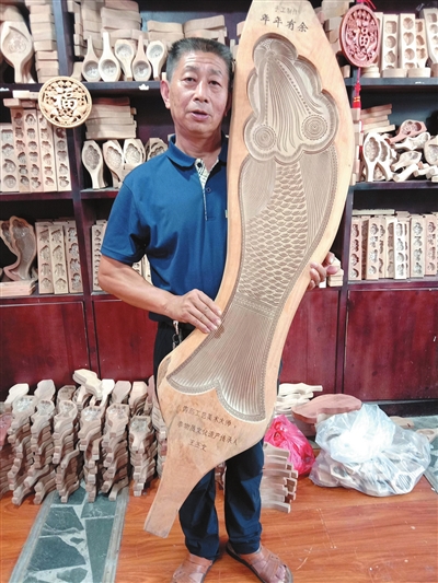王丕文介绍,目前榼子图案已经达到了200多种。除了大家经常见到的“福禄寿喜、十二生肖”图案外,他在传统图案的基础上又进行了创新,做了很多花样图案。比如“龙凤呈祥”婚礼纪念工艺榼子,这种极具审美和收藏价值的工艺榼子特别受欢迎。除此之外,还有五件套迷你型工艺榼子、超大型面鱼榼子,已经不局限于实用,而是作为一种工艺品装饰被不少市民收藏。