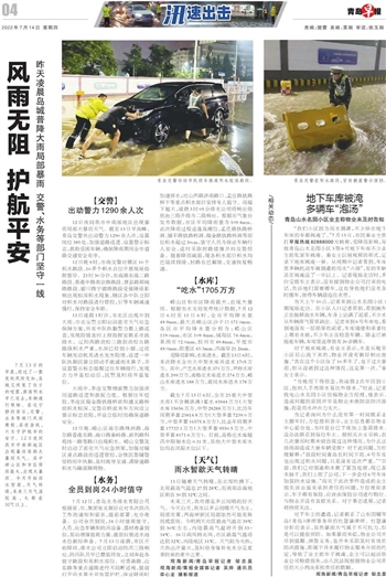 7月13日的早晨,经过了一整夜的风雨交加,岛城又恢复了往日的喧嚣,路面积水早已退去,车辆通行顺畅。在这宁静的背后,交警、水务等部门风雨兼程、昼夜奋战,只为守护城市的安宁。12日夜间我市中南部地区出现暴雨局部大暴雨天气。其中崂山区和市区降雨最大,出现大暴雨。今天开始雨水暂歇,天气转晴,未来三天气温较高,大都在30℃以上。