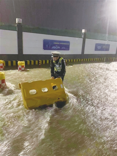 大雨中,李沧交警增派警力加强夜间道路巡逻和救援力度。根据往年经验,李沧区瑞金路铁路桥底和遵义路桥底积水较深,交警在桥底来车方向设立警示标志劝阻,并设立临时岗确保道路安全。