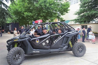 特警队员们将日常训练场搬到了活动现场,展示了精彩的“红蓝对抗”。红方和蓝方两组队员接连进行了抗箱负重跑、翻轮胎、搬原木、枪支分解结合、信任射击、小组协同射击、钻涵洞等项目的对抗,最终用时较少的一方夺旗胜利。每个环节都是对特警队员体能、技能、心理、战术的巨大考验,既展示了特警队员过硬的业务素质和精湛的协作精神,也让小朋友们的心情随着紧张激烈的争夺起伏,一个个激动地蹦起来喊加油、跳起来鼓掌。“红蓝对抗”结束,功能各异的警用无人机盘旋升空,将小朋友们带到了琳琅满目的装备展。各类特种车辆、高精尖装备、武器枪械应有尽有,小朋友们眼花缭乱、兴致盎然。活动最后,部分小朋友还参观并体验了全地形车,陪同特警叔叔一起“出警”。