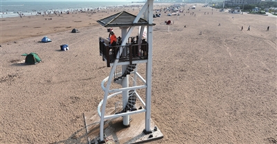 石老人海水浴场负责人郝飞说,他们在浴场四周设置了82处智能探头,后期还将安装人脸识别系统,此外每天还有无人机巡逻,“为了及时发现游泳人员的状态,我们除了设置一处固定瞭望塔外,还有4处移动式瞭望台,每天都安排救生人员值班。”