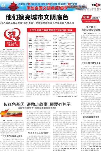 发布仪式现场公布了2022年第二季度青岛市“文明市民”,并为他们颁发荣誉证书。30人以朴实感人的事迹当选“文明市民”,其中包括早报新闻人物李文饶、李欣、吕金光、邢彩丽、于静、陈志宏。他们当中有造血干细胞捐献志愿者,用自己的善行义举为千里之外的小患者送去生命的希望;有见义勇为的退役军人,看到有人坠入湖中,纵身一跃救人于危难;有父老乡亲口中“卖菜的爱心大姐”,大力发展绿色无公害蔬菜种植,带领乡亲走上致富道路;有年近七旬的好婆婆,悉心照顾患病儿媳,用无悔的付出撑起一片爱的晴空;有始终坚持温情调解的“办案状元”,把群众的难事当作自己的大事,10多年来累计处理劳动争议案件2000余件……他们用实际行动践行了社会主义核心价值观,擦亮城市文明底色。