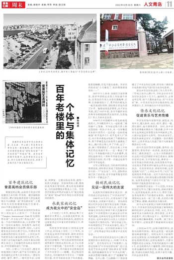 老建筑是青岛百年变迁的参与者、见证者。中山路1号是青岛非常有名的一座老建筑,在不同的历史时期曾经做过“国际俱乐部”“中苏友好馆”“科技馆”等。在百余年的城市发展中,这里曾经见证过友谊,举行过隆重的庆祝活动,承载了岛城市民个体与集体记忆。