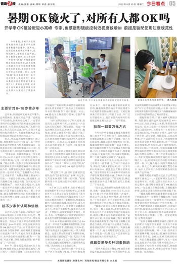 今年暑假,岛城不少医院前来就诊的儿童青少年近视患者数量明显增加。近年来,我国近视发病率逐年攀升,近视低龄化、重度化日益严重,除了框架眼镜外,近几年还有一种俗称“OK镜”的角膜塑形镜出现在国内市场,因为其晚上佩戴白天即可达到清晰裸眼视力的效果,而受到许多家长和学生的青睐。那么,这种“OK镜”是否真的有效?是不是对所有人都适用呢?家长如果要给孩子配眼镜又要注意什么?带着这些问题,记者对正在佩戴角膜塑形镜的学生及眼科专家进行了调查采访。
