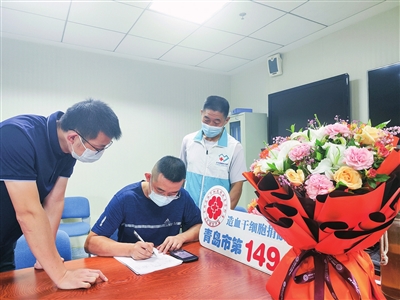 当天早晨,在红十字志愿者陪同下,刘鹏程签下捐献造血干细胞志愿书,随后入住病房,并且注射了第一针动员剂。刘鹏程是鲁红信达砂浆有限公司员工。早在2009年他就参加了无偿献血活动,至今已经献血2800ml。2017年时,他了解到造血干细胞捐献不是抽骨髓,非常科学、安全,无损自身健康却能挽救他人生命,于是决定留样。 (观海新闻/青岛早报首席记者 孙启孟 通讯员 薛梅 摄影报道)