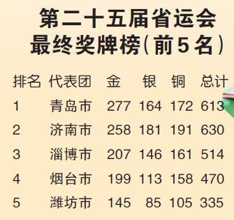 本届省运会于5月底开赛,截至昨天所有项目全部结束,最终的排名位次也随之出炉。青岛代表团以277金164银172铜位居金牌榜榜首,济南代表团收获258金181银191铜位列次席,淄博代表团得到207金146银161铜排名第三,烟台代表团以199金113银158铜牌排第四位,潍坊代表团以145金85银105铜排第五位。