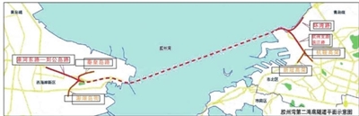 胶州湾第二隧道西起青岛西海岸新区淮河东路,向东沿刘公岛路下方敷设,穿越胶州湾,至青岛港附近登陆,在海泊河河口以高架桥梁形式衔接青岛东岸城区。工程主线全长17.48公里,其中隧道长14.37公里(海域段9.95公里);采用双洞双向六车道的主隧道加中间服务隧道的布置方式,最深点距海平面112米。设计时速80公里,客车、货车可通行。为实现隧道交通流的多级疏解,两岸分别设置了“1主+N辅”多个出入口。