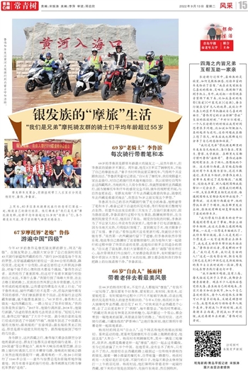 69岁的李鲁滨是群里年龄最大的骑友之一,虽然年龄大,但李鲁滨的骑龄并不算长。两年前,他花3万多买了辆摩托车,开始了自己的摩旅生活。“妻子当时听我说要买摩托车,气得两个月没跟我说话。”李鲁滨笑着对记者说。“自从有了摩托车,我经常跟着大家出去骑行,对自己的骑行技术越来越自信。我以前曾经自驾车去过西藏两次,当地的风土人情令我难忘,我就想骑摩托去西藏旅行,因为骑摩托车和开车的感觉完全不同,骑车的视野更开阔,与自然也更亲近。有群友戏称‘开车去西藏是载着肉体去,骑摩托车去西藏是载着灵魂去’,我想在70岁之前实现这个梦想。”