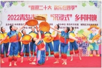 早报10月14日讯 14日下午,由中共青岛市委宣传部、 青岛市文化和旅游局主办,青岛市文化馆、城阳区文化和旅游局承办,城阳区文化馆、城阳区惜福镇街道协办的“欢乐在四季”2022青岛市首届沉浸式乡村村晚,在城阳区惜福镇毛公山下青峰村举行。