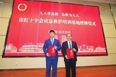 10月20日上午,青岛市红十字应急救护培训基地授牌仪式在青岛大学医学部举行。青岛大学医学部、国家(青岛)军民融合创新示范区(海上防险救生培训基地)被授予“市红十字应急救护培训基地”牌。依托应急救护基地,青岛市红十字会将有序推进红十字应急救护培训,不断彰显应急救护培训的生命教育功能,在全社会营造“人人学急救、急救为人人”的浓厚氛围。记者从现场获悉,早报新闻人物管延伟和邵钰卿日前获评山东省“最美红十字救护员”,其中,管延伟将被山东省推选参加全国2022年度“寻找最美救护员”评选活动。