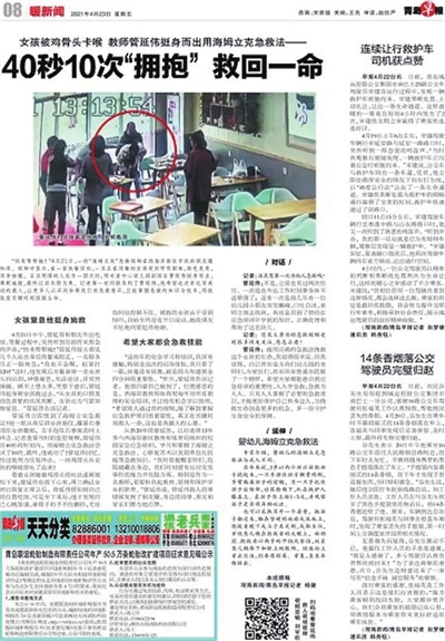 20日的仪式现场还表彰了一批今年以来应急救援、培训等方面表现优秀的集体和个人,并分别颁发了奖牌、证书及奖金。现场受表彰的还有两名青岛早报新闻人物——管延伟和邵钰卿,他们遇到突发情况及时出手相救,用学到的急救技能成功挽救了他人的生命。两人日前均获评山东省“最美红十字救护员”,其中,管延伟还将被山东省推选参加全国2022年度“寻找最美救护员”评选活动。
