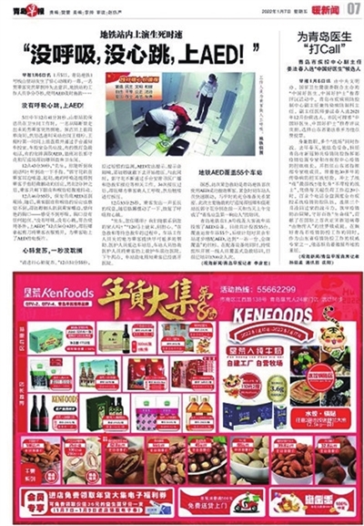 今年1月5日中午,一名男乘客在青岛地铁1号线南段山里站洗手间突然晕倒,地铁员工邵钰卿立即前往查看,只见乘客只有眼皮和喉结轻微抖动,随后失去心跳和呼吸。“没有呼吸,没有心跳,符合使用条件,上AED!”邵钰卿立即剪开乘客衣服,贴上AED电极片,并根据AED提示辅助进行心肺复苏,在短时间内挽救了乘客的生命。乘客恢复意识后,邵钰卿第一时间对其进行了心理安慰和疏导。随后,急救车抵达车站,乘客被抬上急救车送往医院。当天下午,乘客康复出院。
