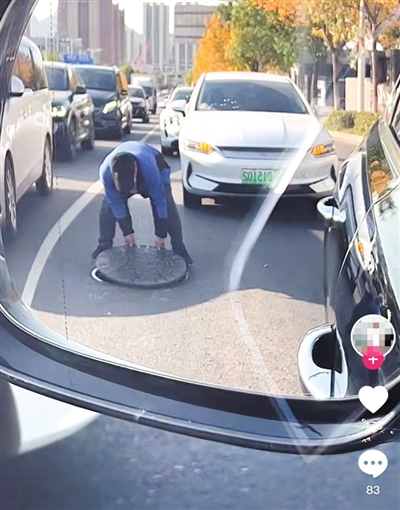“当时阳光比较刺眼,行驶至跟前才发现这个井没盖。”李女士说。路过古力井后,路口的直行信号灯转为红灯,李女士便停车等候。此时,李女士听到后方传来井盖移动的声音,她通过车辆后视镜看到,原来是后方的一辆白色比亚迪车在古力井附近停下车,车辆打着双闪,驾驶员正手脚并用,一点点将沉重的井盖挪回原位。“我看到这一幕后,心里特别感动,赶紧打开手机,把经过拍了下来,并上传到网上。”李女士说。