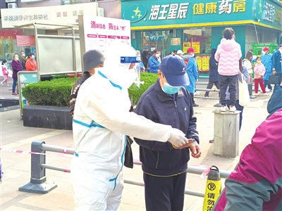 “湖光山色小区的居民从清晨5点开始做核酸检测。我们注意到,不少家长带着孩子下楼排队,天气比较冷,我们分头上阵引导居民,有的用小喇叭喊话,有的现场动员,很快居民就给孩子们让出一条‘绿色通道’,方便孩子们优先做核酸检测。”